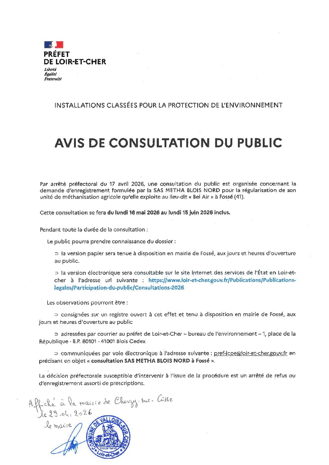 • avis de consultation et arrêté préfectoral du 13 avril